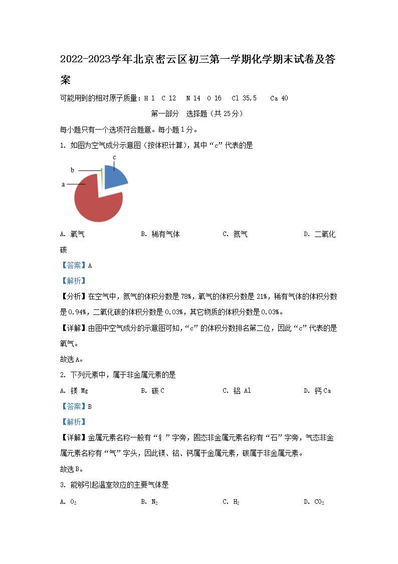 2022-2023学年北京密云区初三第一学期化学期末试卷及答案(Word版)08-04