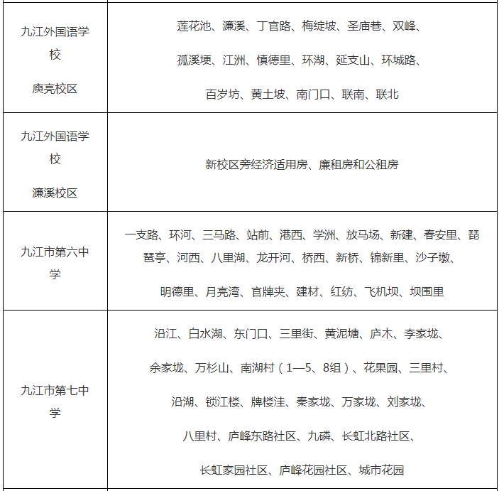 附表:2023年九江市中心城区初中学校学区范围