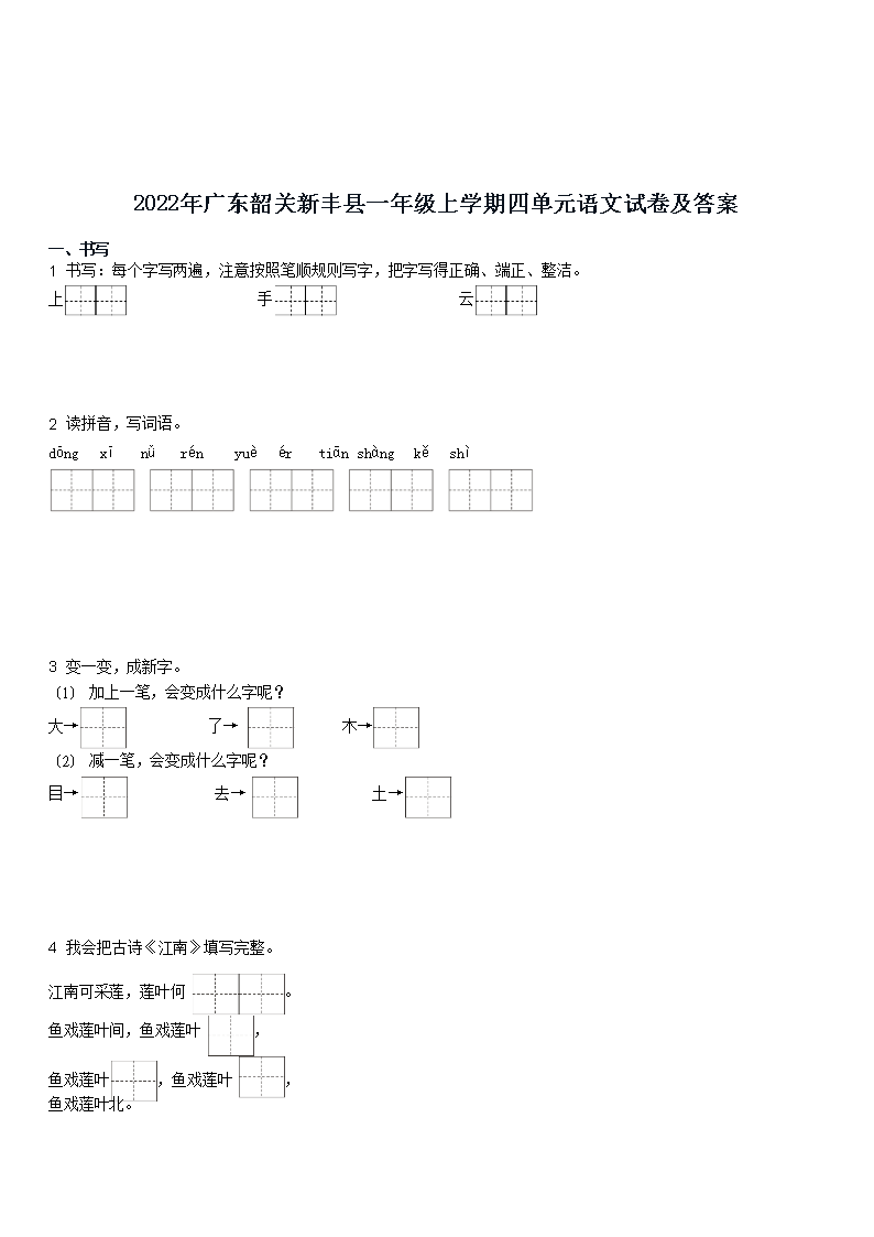 【文档预览】 文档大全网整理发布2022年广东韶关新丰县一年级上学期四单元语文试卷及答案(Word版),前五页预览如下: