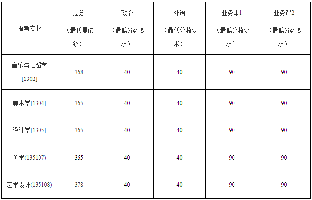 考生的初试成绩必须符合“艺术学院硕士研究生入学考试复试各专业复试分数线”的基本要求。依据吉林大学相关文件,艺术学院音乐与舞蹈学[1302]和设计学[1305]按照招生名额的120%进行复试划线,艺术设计(135108)按照招生名额的130%进行复试划线,美术学[1304]和美术(135107)上线率不足或等同于100%,上学校分数线考生全部进入复试,复试分数线为学校分数线。按比例计算进入复试人数,小数点后第一位四舍五入,同分并列考生全部进入复试。
