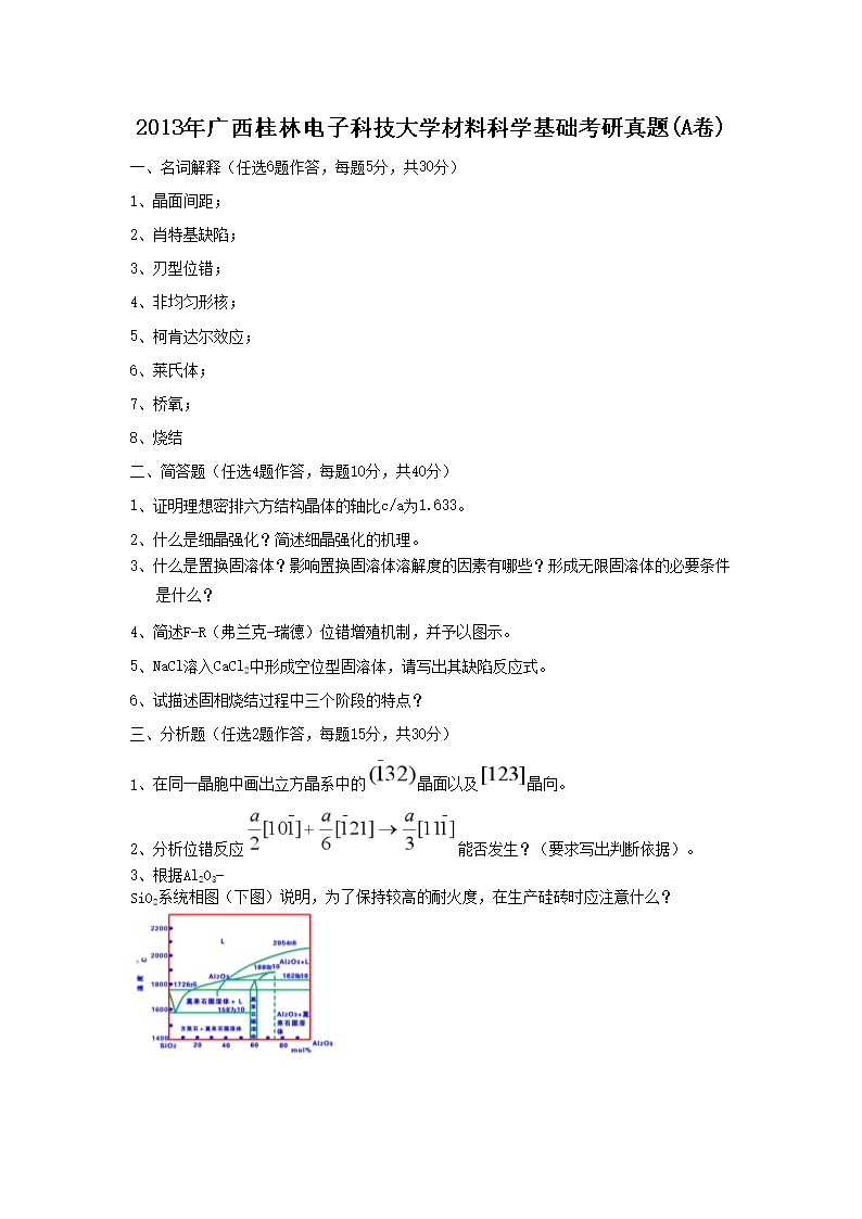 2013年广西桂林电子科技大学材料科学基础考研真题(A卷)(Word版)05-31