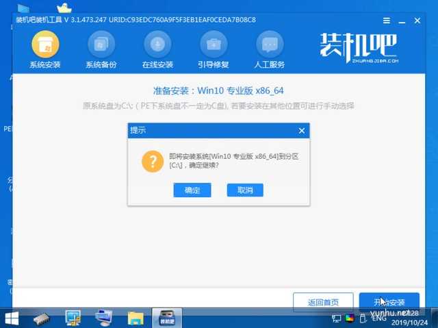 9、选择将系统安装在C盘后,点击开始安装,弹出小窗口点击确定。