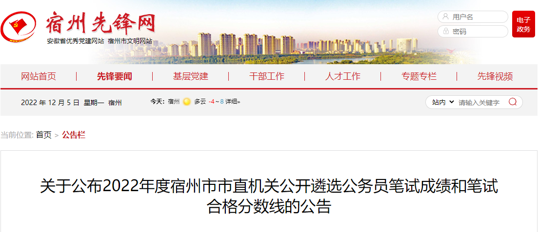 原文标题:关于公布2022年度宿州市市直机关公开遴选公务员笔试成绩和笔试合格分数线的公告