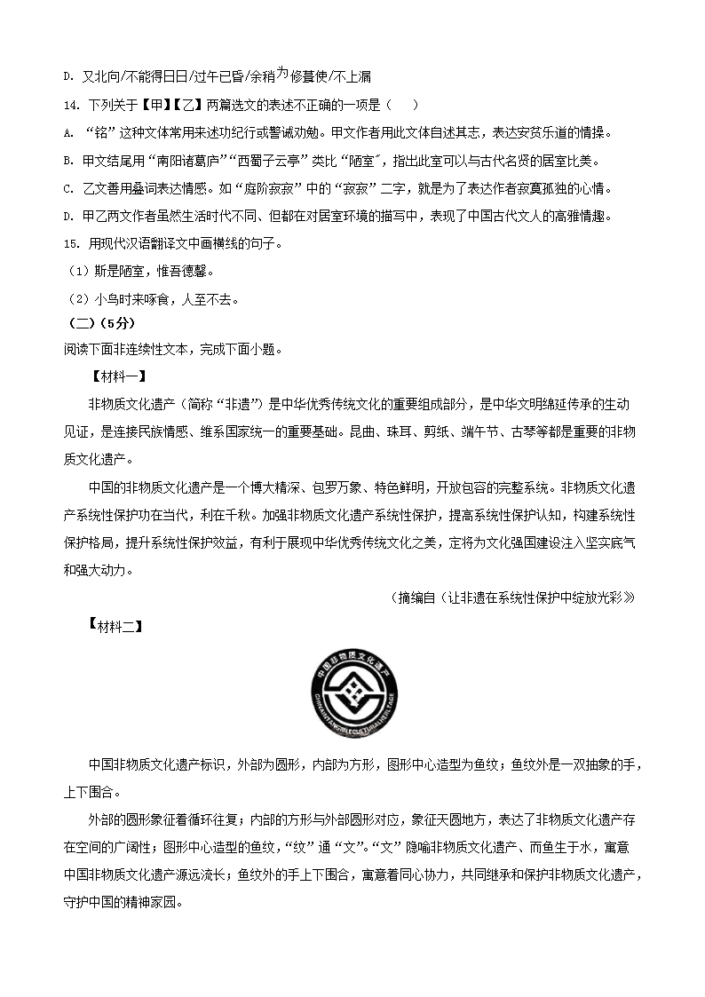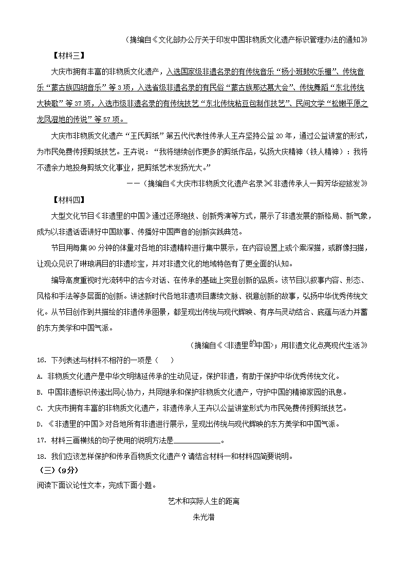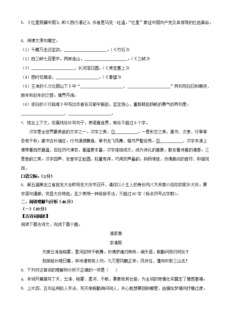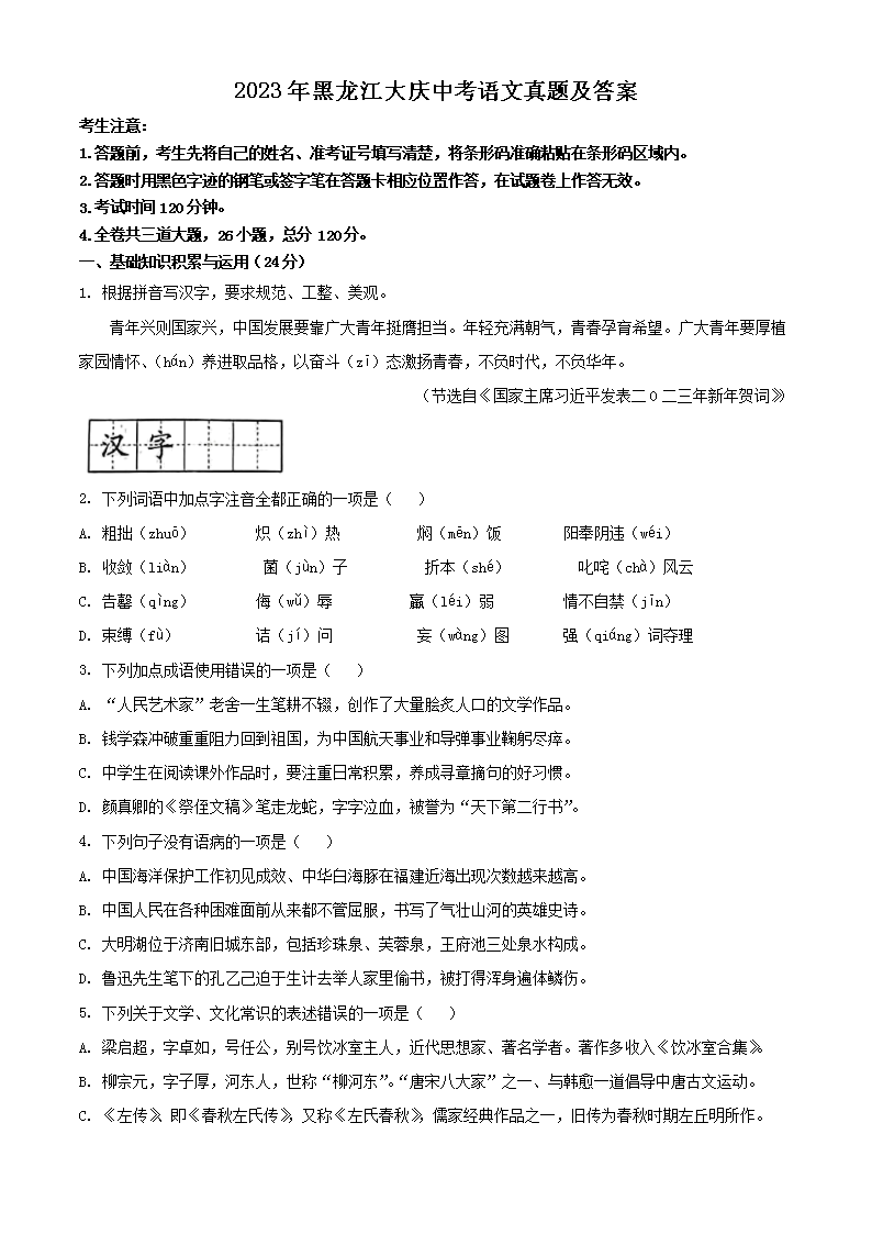 2023年黑龙江大庆中考语文真题及答案(Word版)09-05