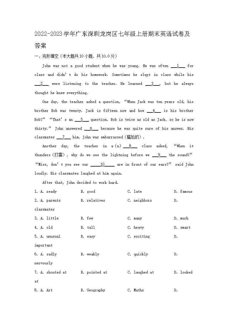 2022-2023学年广东深圳龙岗区七年级上册期末英语试卷及答案(Word版)09-26
