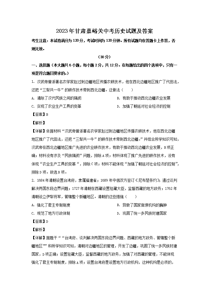 【文档预览】 文档大全网整理发布2023年甘肃嘉峪关中考历史试题及答案(Word版),前五页预览如下: