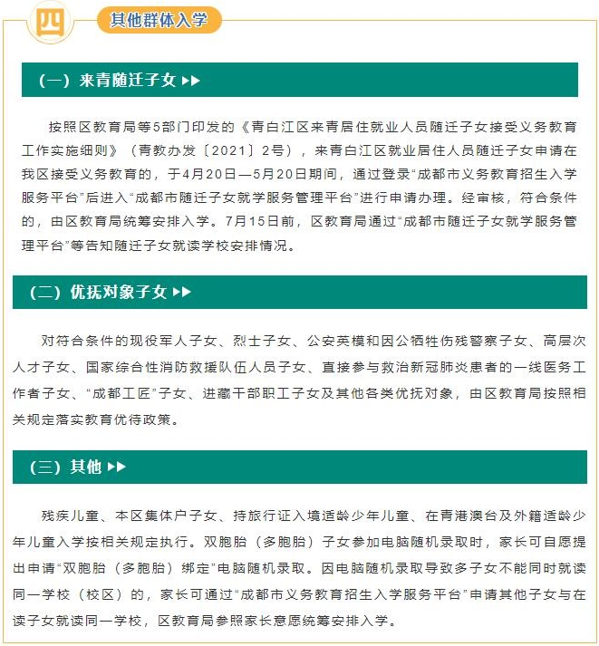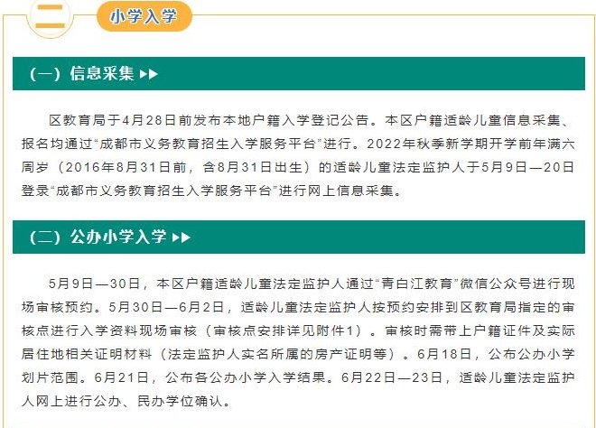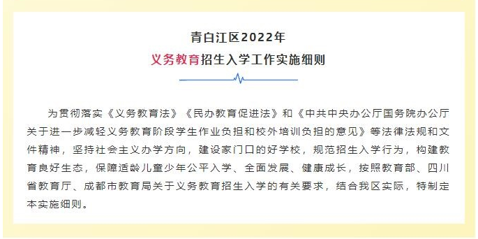 【#小升初# 导语】®文档大全网小升初频道从成都招生考试网了解到,2022年四川成都青白江区义务教育招生入学工作实施细则已发布,详情如下: