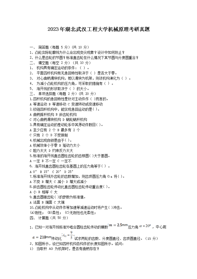 2023年湖北武汉工程大学机械原理考研真题(Word版)10-17