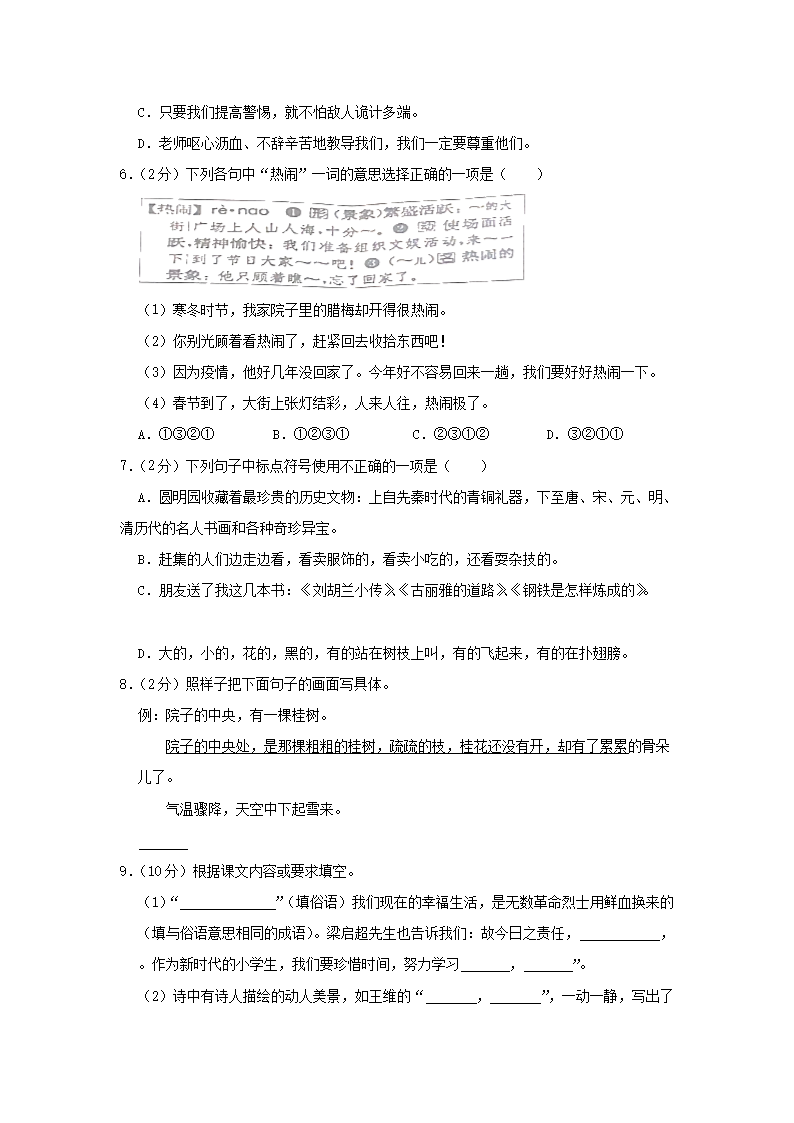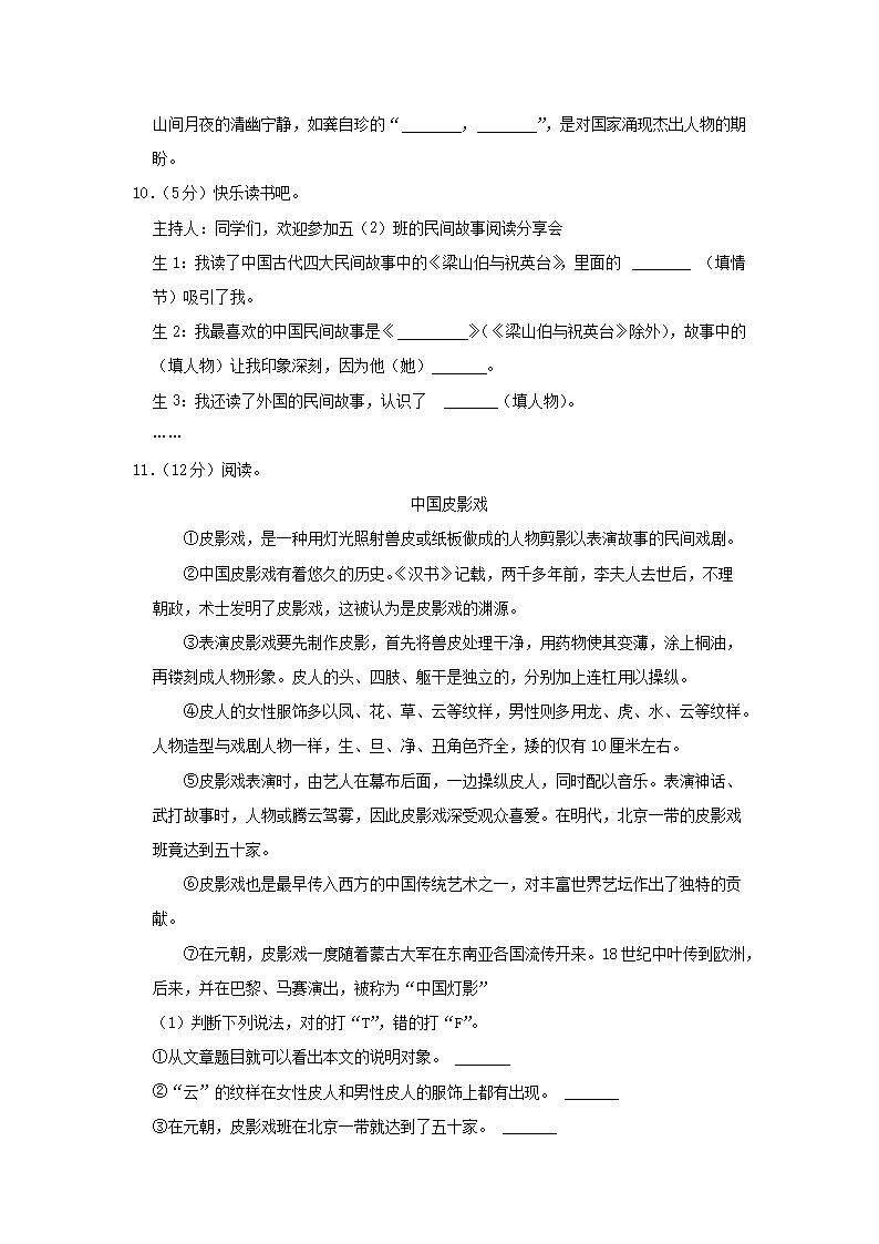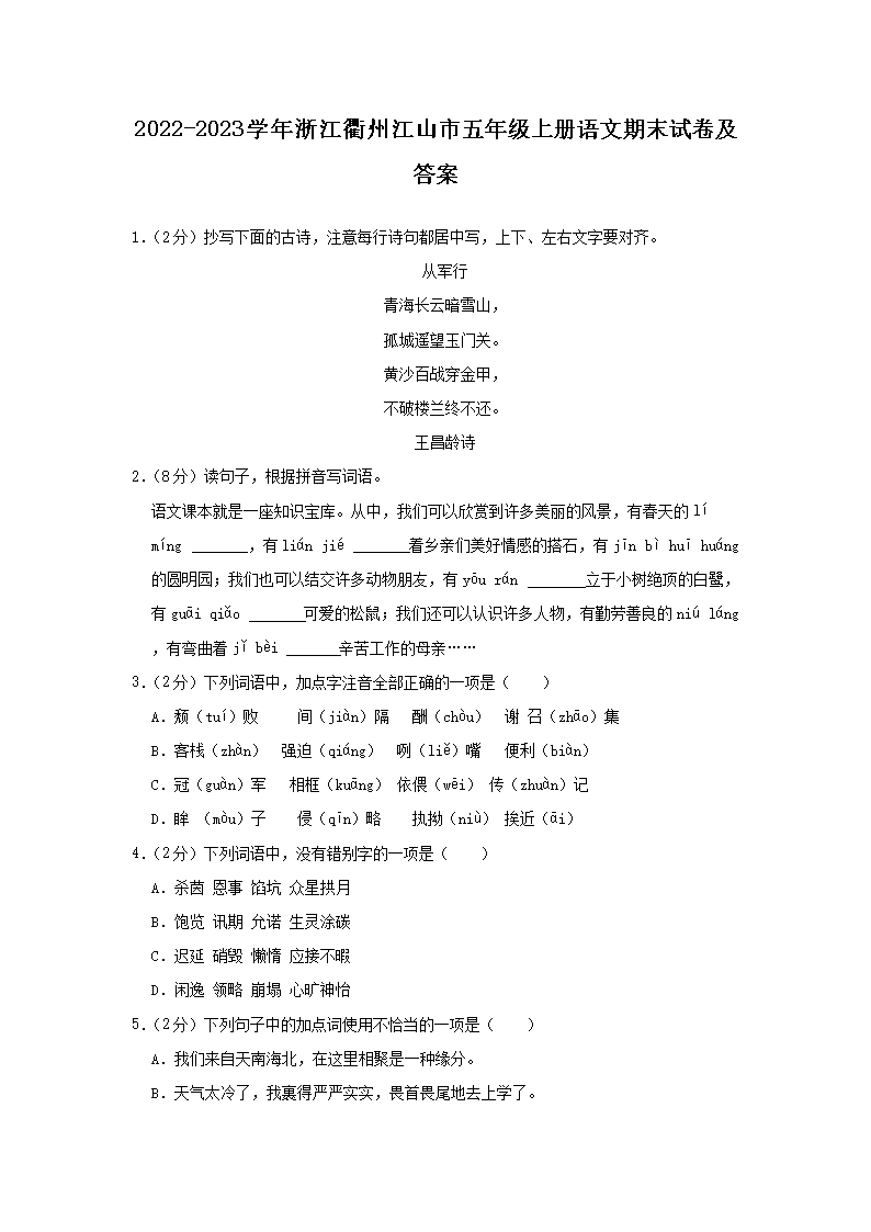 2022-2023学年浙江衢州江山市五年级上册语文期末试卷及答案(Word版)08-01