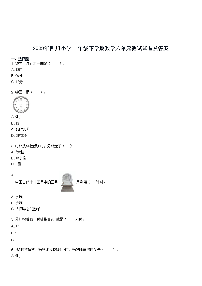 2023年四川小学一年级下学期数学六单元测试试卷及答案(Word版)07-05