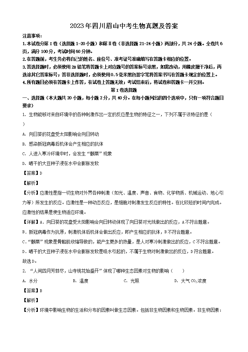【文档预览】 文档大全网整理发布2023年四川眉山中考生物真题及答案(Word版),前五页预览如下: