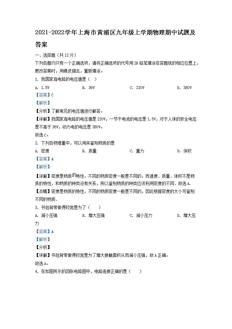 2021-2022学年上海市黄浦区九年级上学期物理期中试题及答案(Word版)10-21