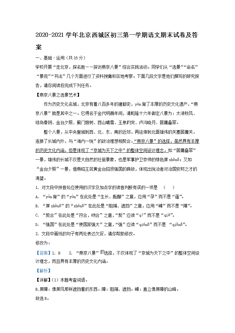 【文档预览】 文档大全网整理发布2020-2021学年北京西城区初三第一学期语文期末试卷及答案(Word版),前五页预览如下: