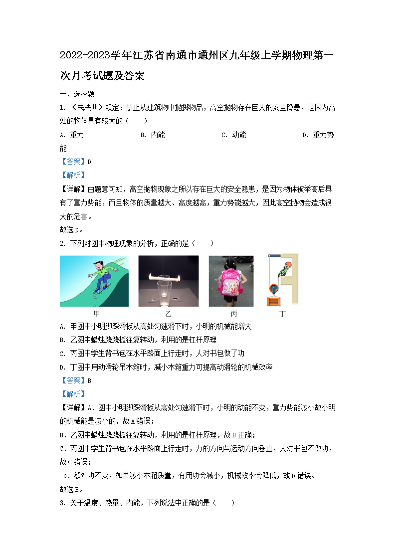2022-2023学年江苏省南通市通州区九年级上学期物理第一次月考试题及答案(Word版)10-13
