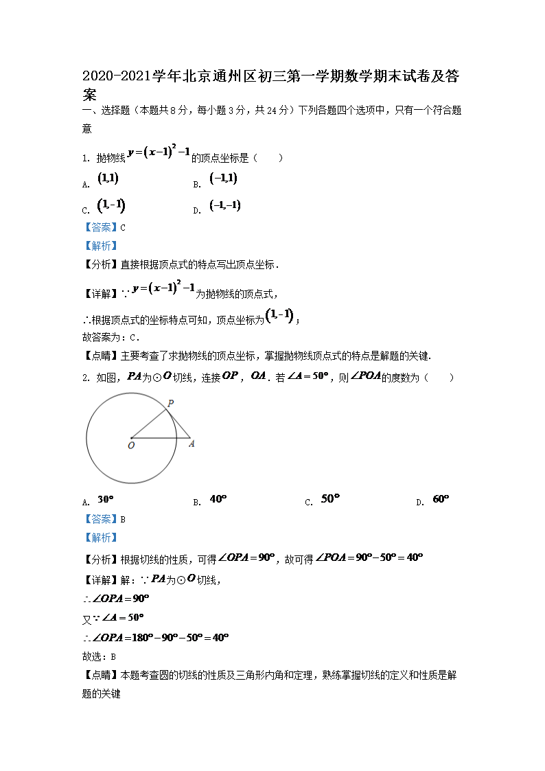 【文档预览】 文档大全网整理发布2020-2021学年北京通州区初三第一学期数学期末试卷及答案(Word版),前五页预览如下: