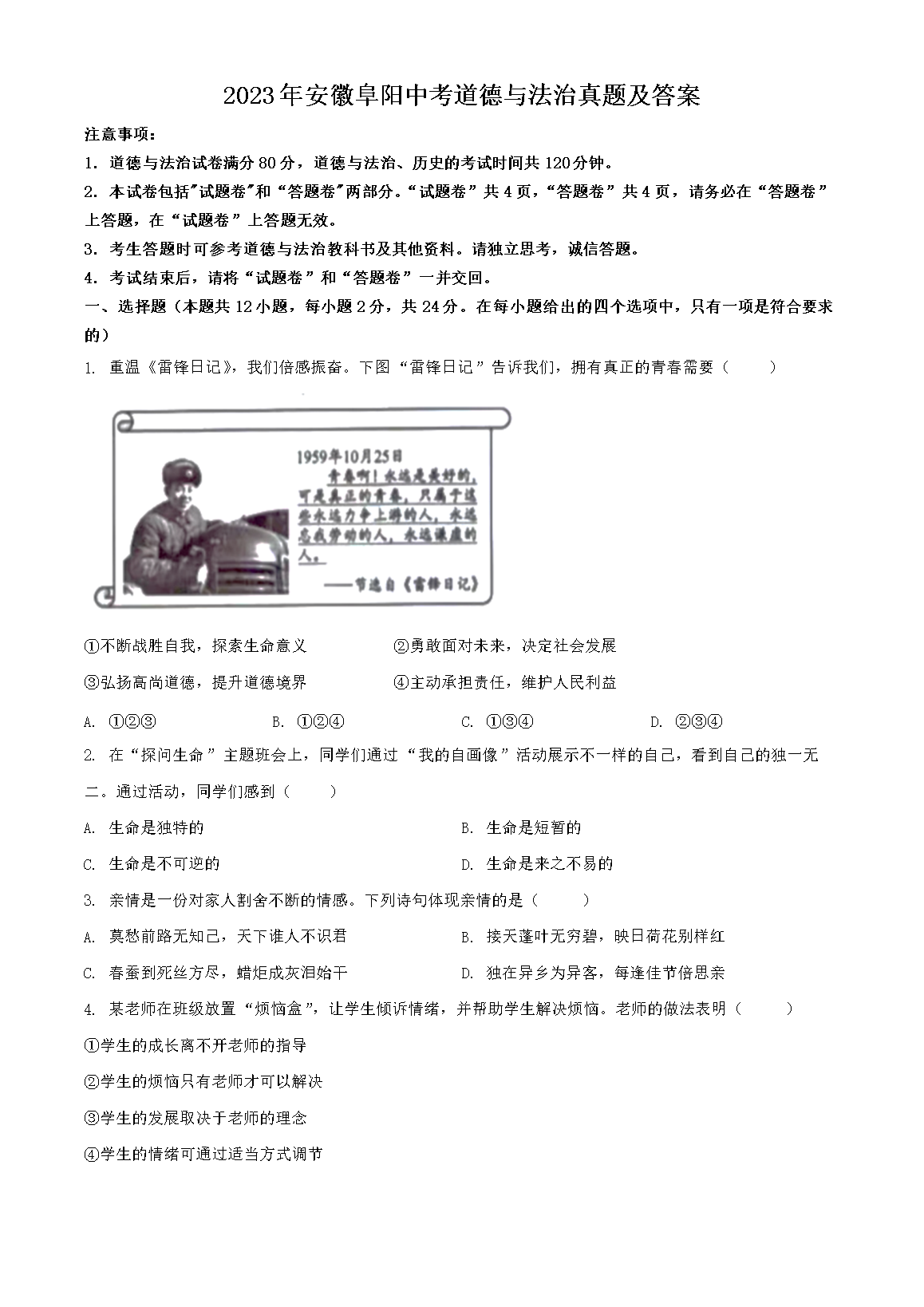 【文档预览】 文档大全网整理发布2023年安徽阜阳中考道德与法治真题及答案(Word版),前五页预览如下: