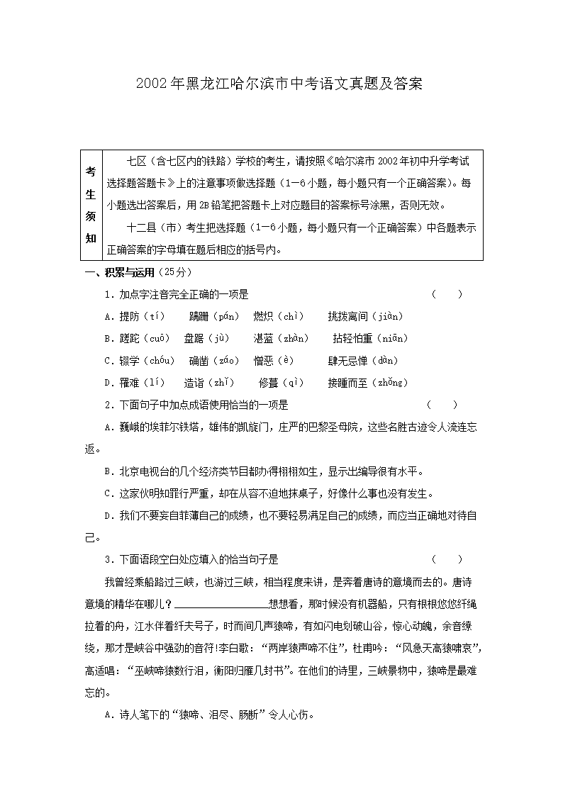 【文档预览】 文档大全网整理发布2002年黑龙江哈尔滨市中考语文真题及答案(Word版),前五页预览如下: