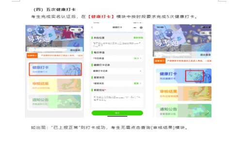 (三)考生须登录“甘肃教育考试易考通”微信小程序进行5次健康打卡。第一次健康打卡时间:10月21日8:00时至22日18:00时;第二次健康打卡时间:10月26日8:00时至18:00时;第三次健康打卡时间:10月29日8:00时至18:00时;第四次健康打卡时间:11月2日8:00时至18:00时;第五次健康打卡时间:11月4日8:00时至16:00时。健康打卡时“易考通”会通过人脸及身份证识别方式对打卡人身份进行验证,自动获取打卡人所处地理位置和近一周核酸检测情况(具体操作流程见附件)。
