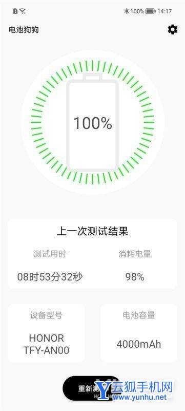 电池狗狗我们勾选极限电量续航测试,手动50%亮度,从100%开始测试,用时8小时53分后关机,比市面的上竞品采用5000毫安的手机多约一个小时半的续航。