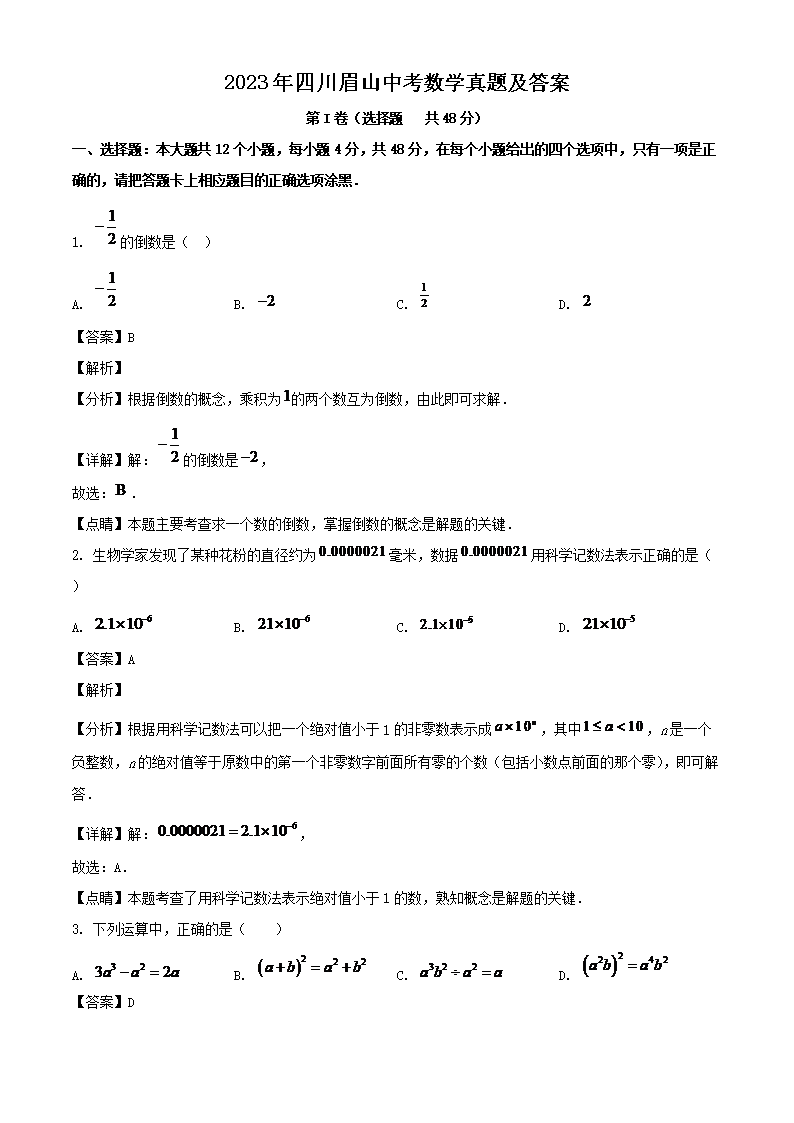 2023年四川眉山中考数学真题及答案(Word版)06-22