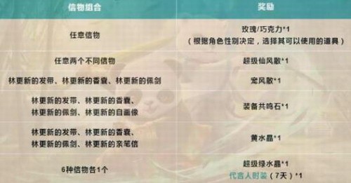使用不同的1~6种信物组合,可兑换不同奖励。