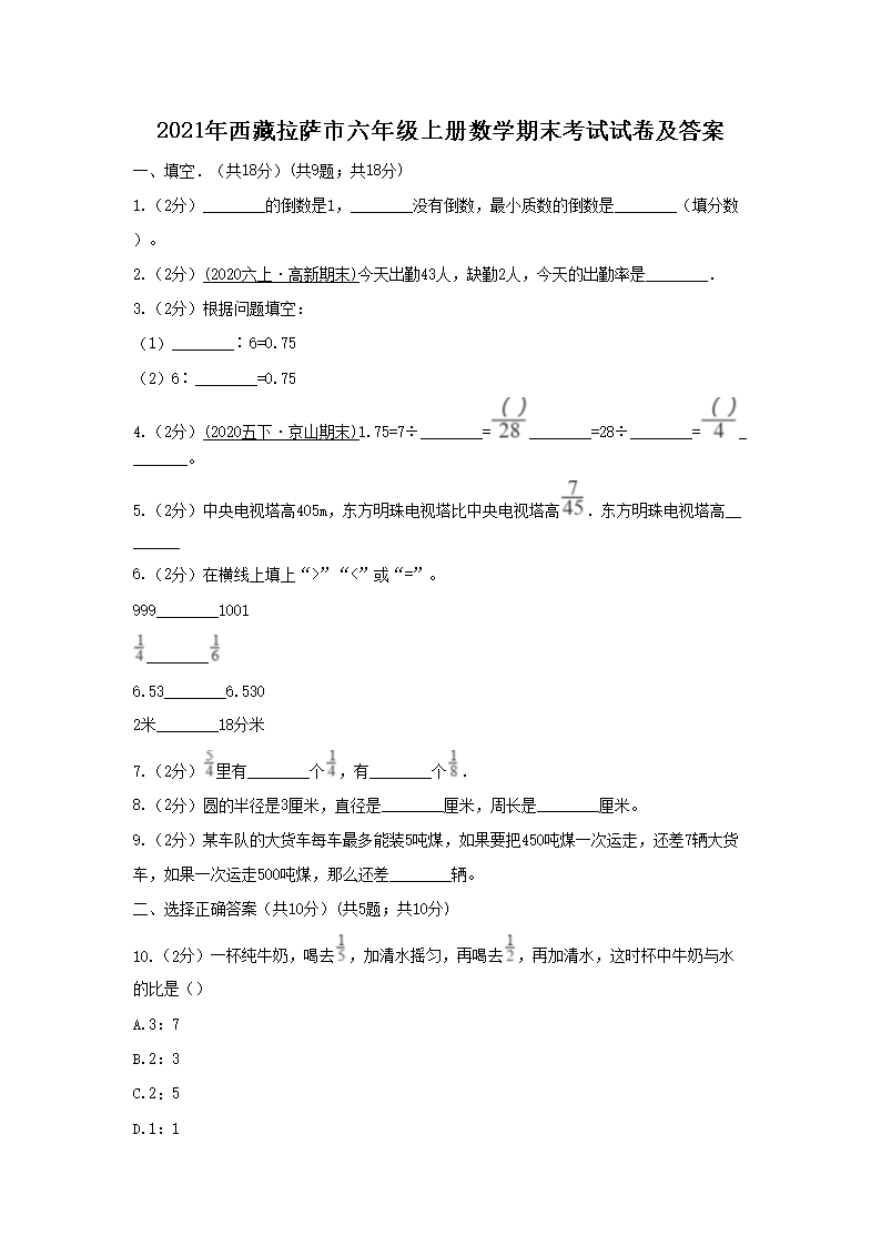 2021年西藏拉萨市六年级上册数学期末考试试卷及答案(Word版)07-01