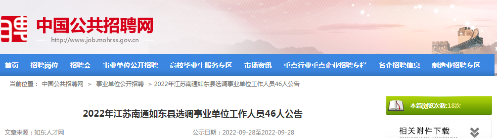 原文标题:2022年江苏南通如东县选调事业单位工作人员46人公告