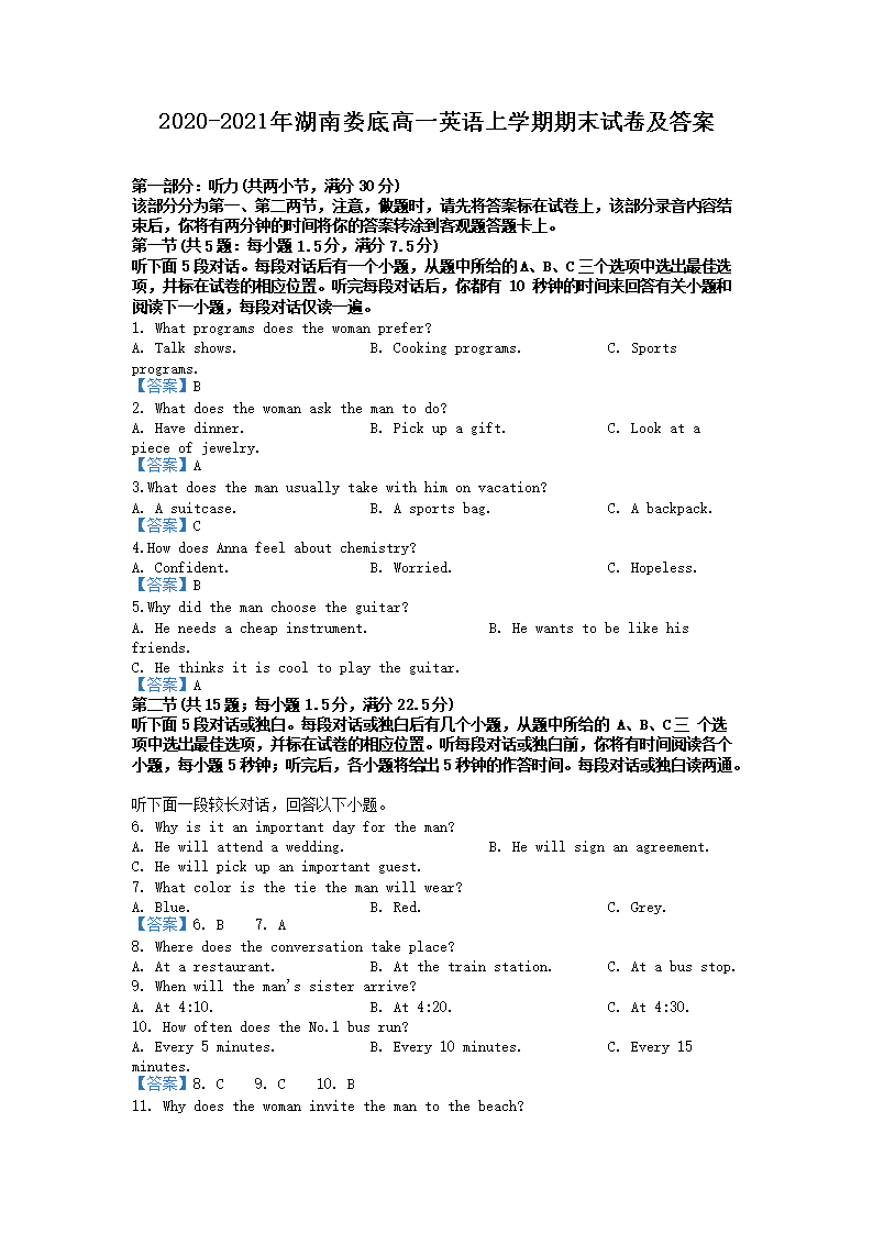 【文档预览】 文档大全网整理发布2020-2021年湖南娄底高一英语上学期期末试卷及答案(Word版),前五页预览如下: