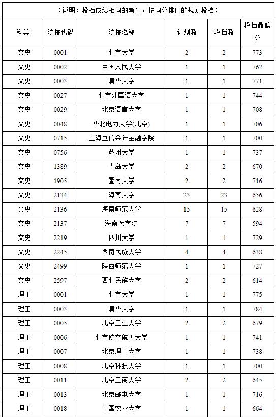 海南省国家专项计划平行志愿投档分数线公布06-25