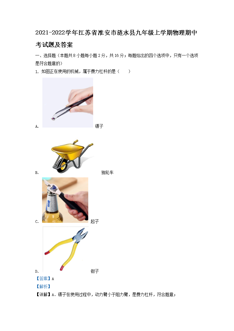 2021-2022学年江苏省淮安市涟水县九年级上学期物理期中考试题及答案(Word版)10-09