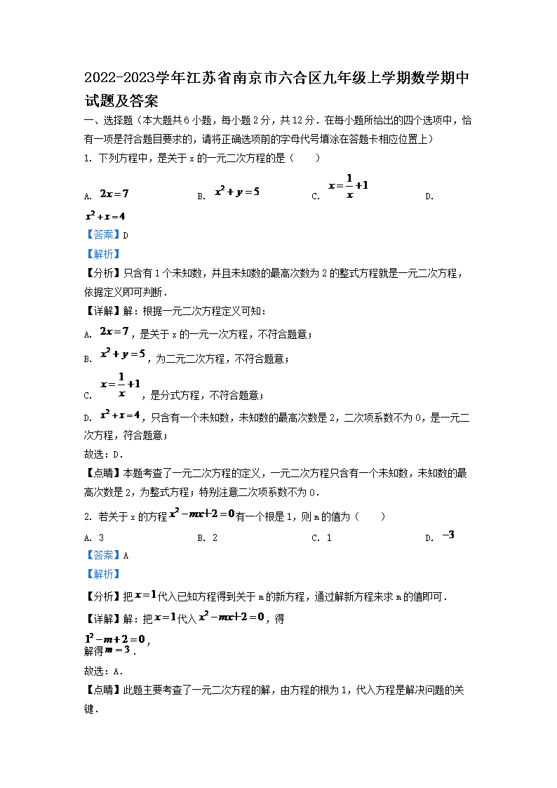 2022-2023学年江苏省南京市六合区九年级上学期数学期中试题及答案(Word版)09-23