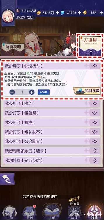 4、建议前几天不使用快速战斗,在到达500层后再到万事屋中进行找回(最多可存3天),以达到快速战斗资源最大化利用的效果。