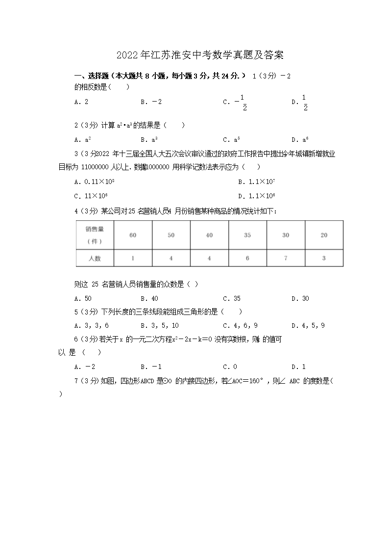 2022年江苏淮安中考数学真题及答案(Word版)05-31