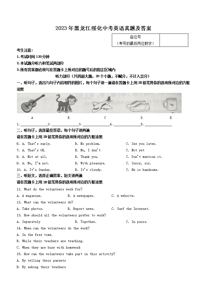 【文档预览】 文档大全网整理发布2023年黑龙江绥化中考英语真题及答案(Word版),前五页预览如下: