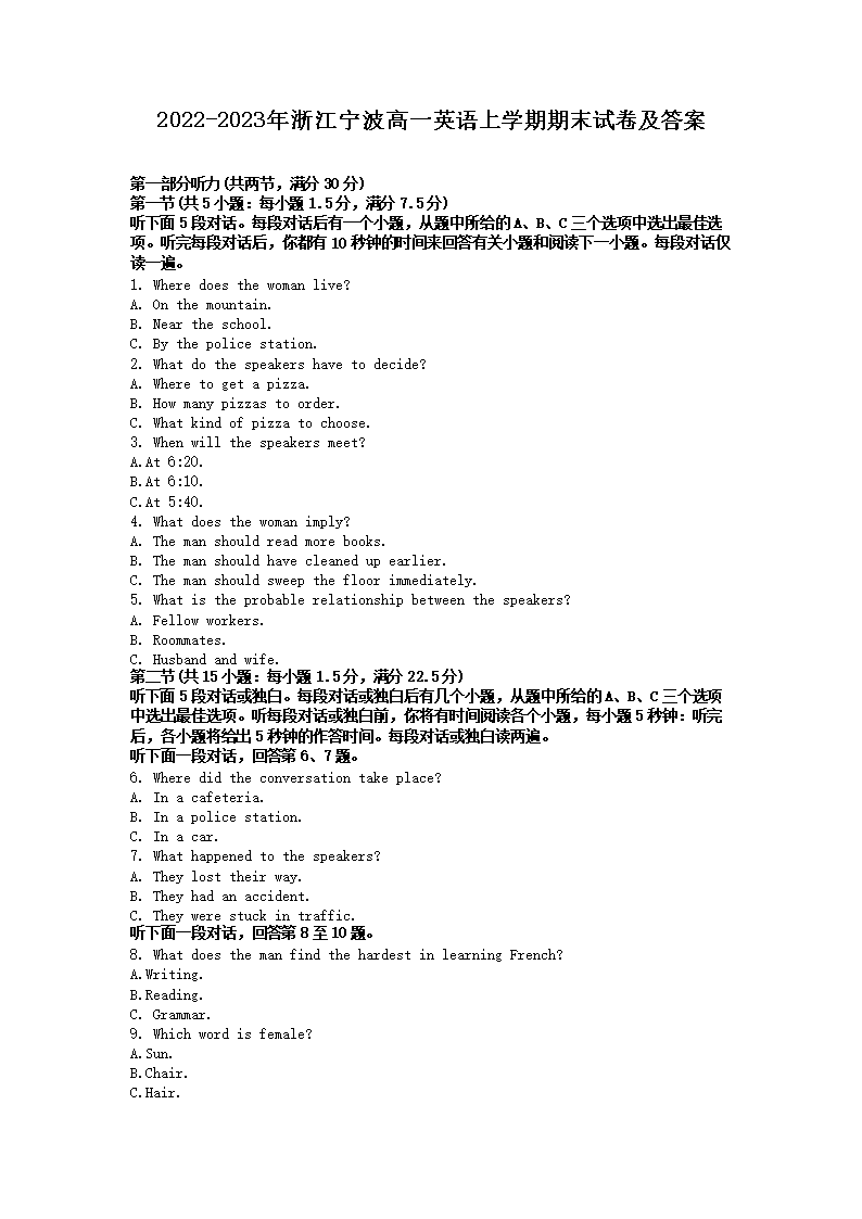 【文档预览】 文档大全网整理发布2022-2023年浙江宁波高一英语上学期期末试卷及答案(Word版),前五页预览如下:
