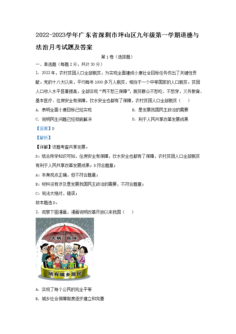 2022-2023学年广东省深圳市坪山区九年级第一学期道德与法治月考试题及答案(Word版)08-22