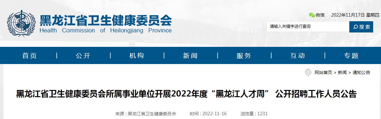 2022黑龙江省卫生健康委员会所属事业单位开展“黑龙江人才周”工作人员公开招聘公告11-18