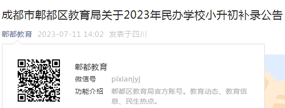 四川成都市郫都区2023年民办学校小升初补录公告(报名时间7月12日)07-12