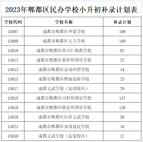 按照成都市教育局《关于做好2023年义务教育招生入学工作的通知》(成教办〔2023〕2号)要求,根据7月8日-9日初中学位确认情况,郫都区部分民办学校小升初还有补录计划,现将补录相关事宜公告如下。