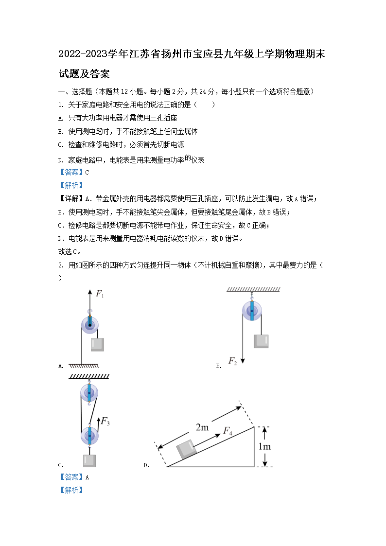 2022-2023学年江苏省扬州市宝应县九年级上学期物理期末试题及答案(Word版)10-14