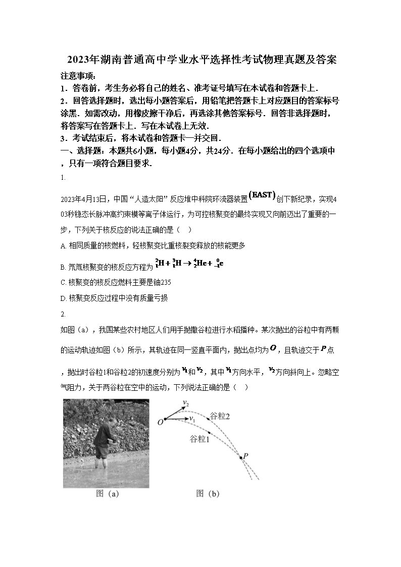 2023年湖南普通高中学业水平选择性考试物理真题及答案(Word版)06-14