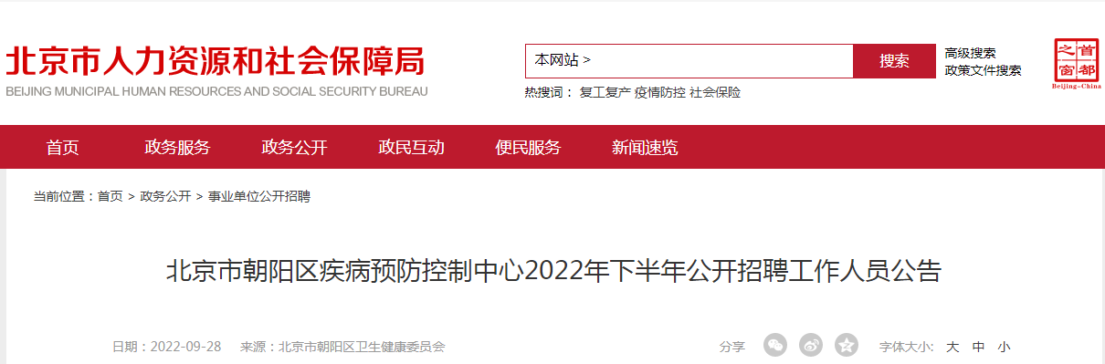 2022年下半年北京市朝阳区疾病预防控制中心工作人员公开招聘公告09-29