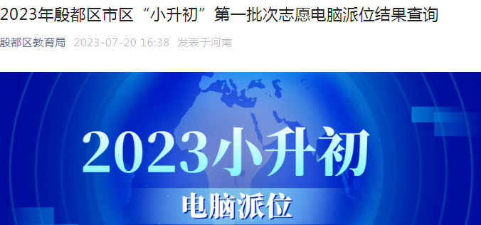 点击进入:2023年河南安阳殷都区市区“小升初”第一批次志愿电脑派位结果查询入口