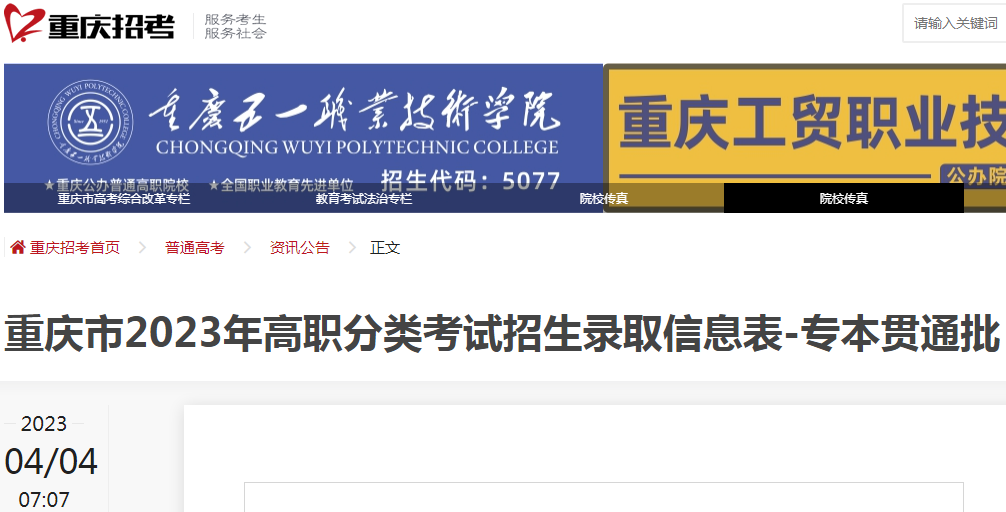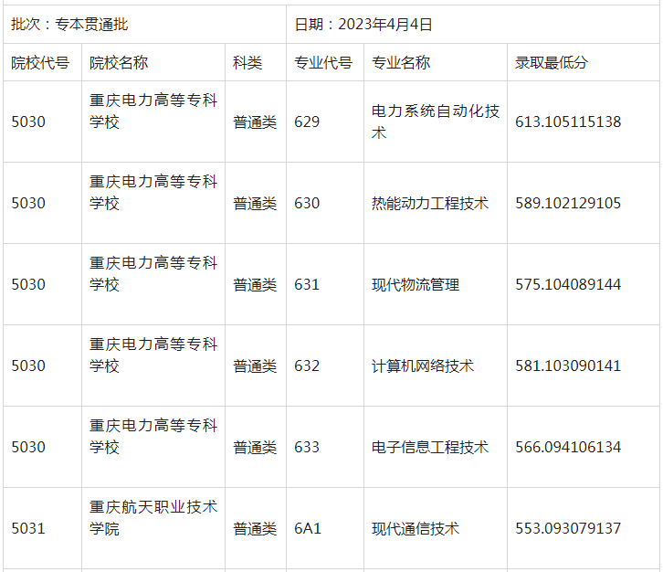 点击查看:重庆市2023年高职分类考试招生录取信息表(专本贯通批)