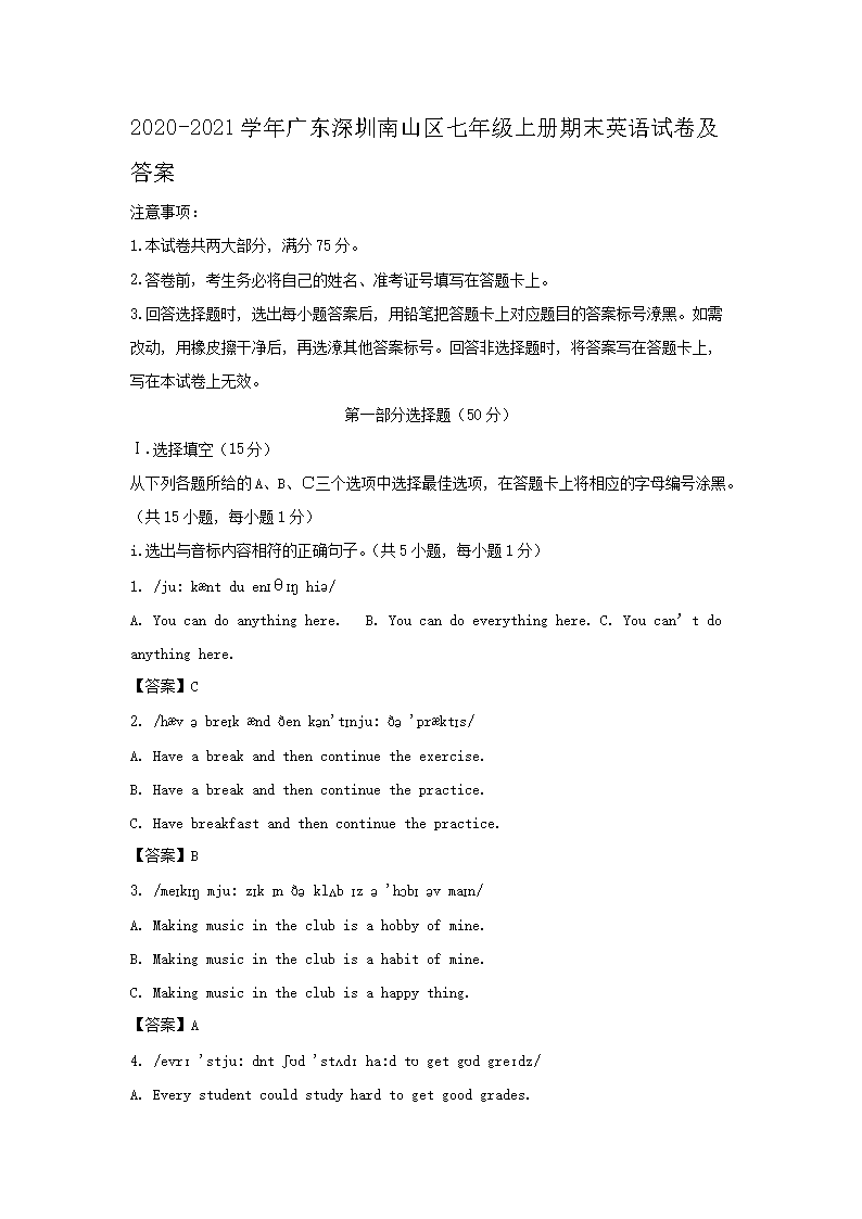 【文档预览】 文档大全网整理发布2020-2021学年广东深圳南山区七年级上册期末英语试卷及答案(Word版),前五页预览如下: