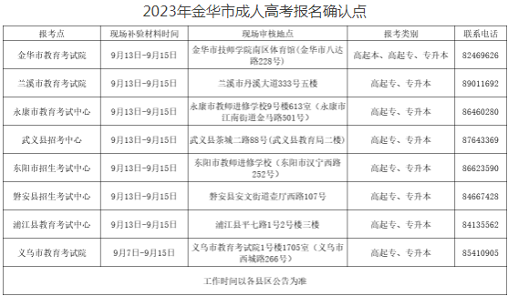 1.金华市区及金华各县(市)均设成人高考报名点,其中金华市区报名点接受金华市区专升本、金华市区高起专、全市高起本报名,各县(市)报名点接受专升本、高起专报名,不接受高起本报名。
