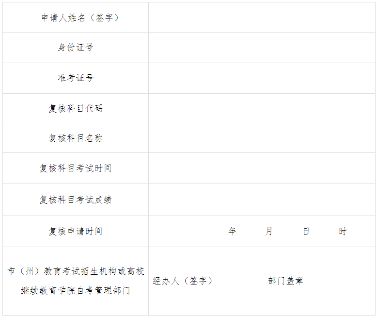 若考生对本人成绩有异议,请于5月25日前携带本人有效证件,前往考籍所在市(州)教育考试招生考试机构或高校继续教育学院自考管理部门提出成绩复核申请(见附件),逾期不予受理。
