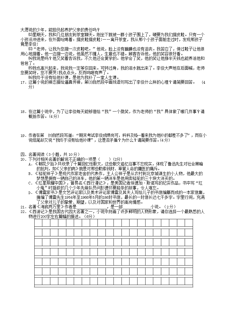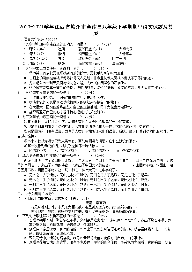 2020-2021学年江西省赣州市全南县八年级下学期期中语文试题及答案(Word版)10-19