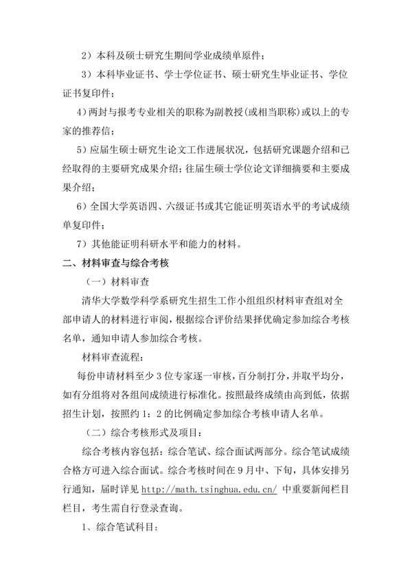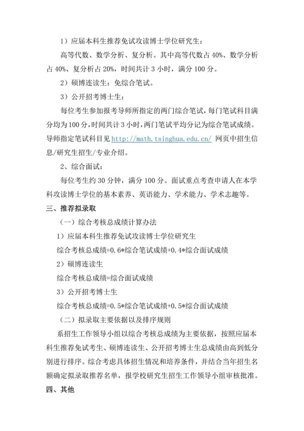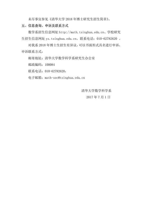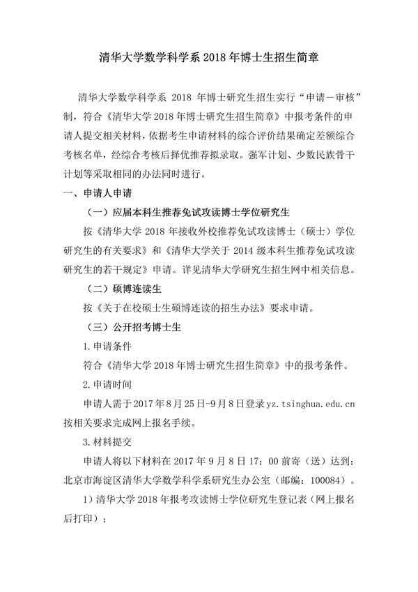 【#考博# 导语】©文档大全网考博频道将第一时间发布各招生单位2018年博士研究生招生简章、考博专业目录、考博参考书目、及导师联系方式,请考博考生密切关注。以下是《2018年清华大学数学科学系博士研究生招生简章》。