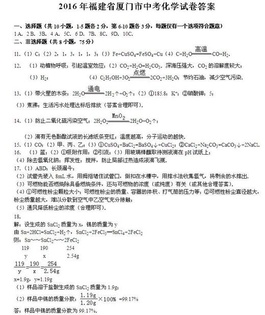 2016福建厦门中考化学答案(已公布)04-13